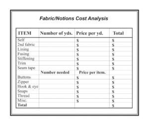 | The fabric and notions’ cost needs to be determined. Years ago some companies tripled the total cost of materials used in the making of a garment to give the wholesale price. Now the price is often whatever the market will bear.(Chart 3-10, page 35, Sewing Techniques from the Fashion Industry) |